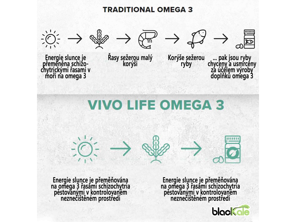 VIVO LIFE omega 3 se získává z mořských řas, a pěstuje se v kontrolovaném prostředí bez znečištění a je testována na těžké kovy, PCB, dioxiny a jiné škodlivé kontaminanty třetí stranou. Spotřeba omega 3 z mořských řas je nejčistší formou omega 3, která je k dispozici. Je to proto, že v důsledku znečištění oceánů obsahuje většina ryb škodlivé úrovně těžkých kovů a dalších kontaminujících látek. Jeden z mýtů je také, že nejlepší forma OMEGA 3 pochází z ryb, to není úplně tak pravda, protože ryby se živí planktonem a právě mořskými řasami, pokud jíme ryby, získáváme omega 3 v zprostředkované formě, pokud chceme kvalitní omega 3 přímo od zdroje, jsou to právě řasy.